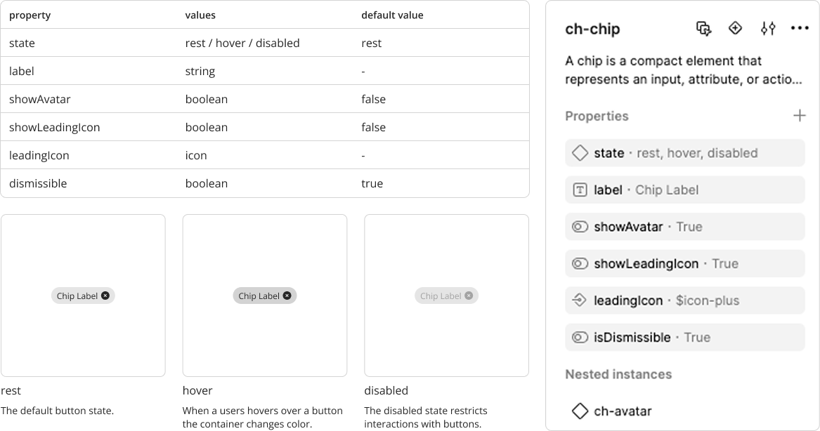 We used Figma’s component properties and variables to make atoms robust and flexible. For example, a button can toggle icons, adjust labels, or swap states without duplicating components.