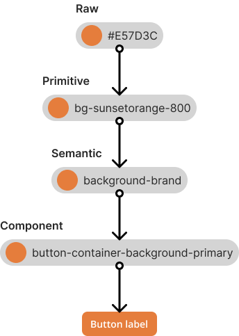 - Component-specific tokens — final mappings applied to individual components (e.g., button-container-background-primary).